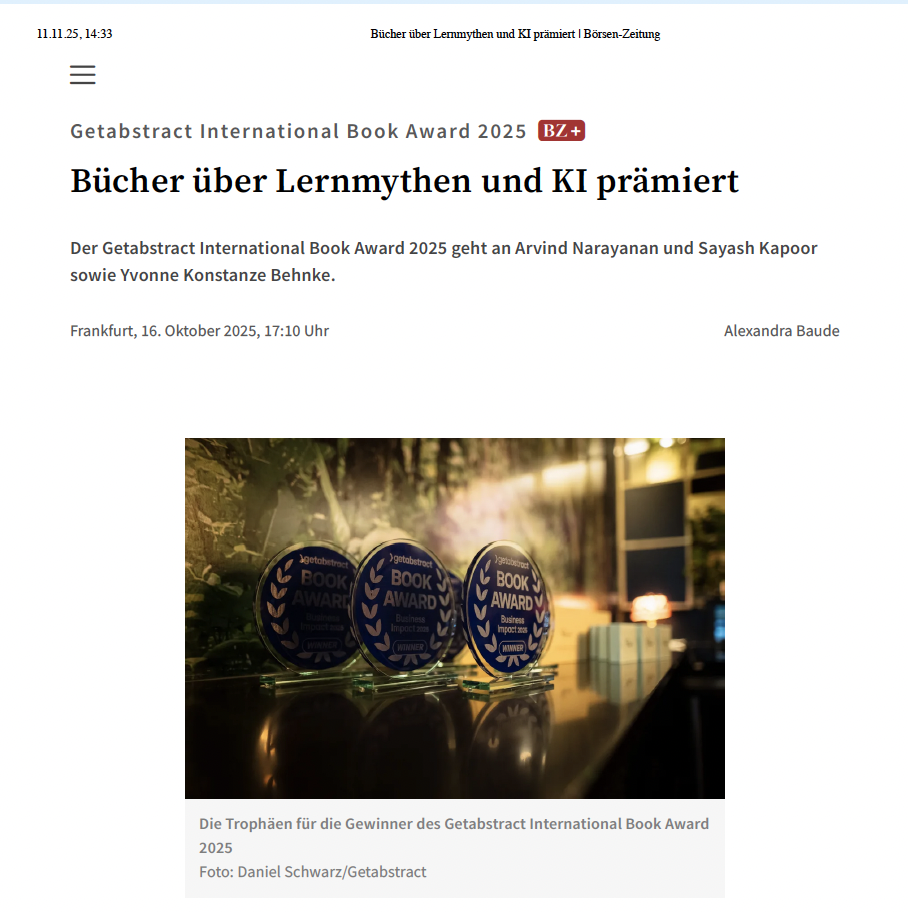 Artikel in der Börsenzeitung über den getAbstract Book Award 2025 vom 16.10.2025 | |